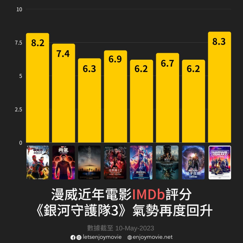 從漫威Marvel近年推出的八部電影IMDb評分來看,在三代蜘蛛俠同框的《蜘蛛俠:不戰無歸/蜘蛛人:無家日/Spider-Man: No Way Home》後,評分開始逐漸下滑,在《尚氣與十環幫傳奇/尚氣與十環傳奇/Shang-Chi and the Legend of the Ten Rings》時還有7.4的好評,到了《永恆族/Eternals》與今年初上映的《蟻俠與黃蜂女:量子狂熱/蟻人與黃蜂女:量子狂熱/Ant-Man and the Wasp: Quantumania》都降到了6開頭。