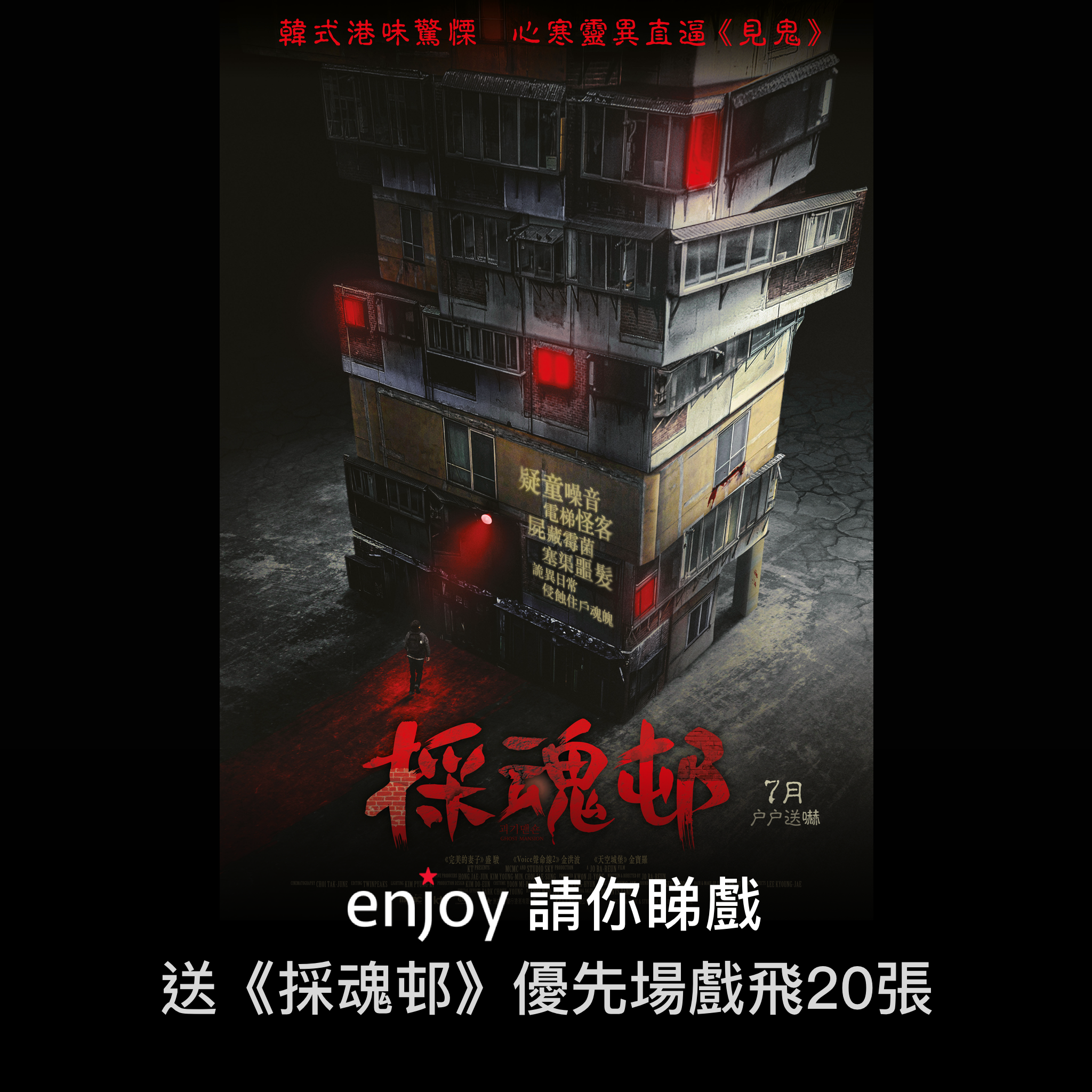- [留言 Comment] 喺呢個Facebook post,tag兩位朋友,同埋寫低點解你想睇《採魂邨》,例:「@AAA @BBB 《採魂邨》同《見鬼》一樣咁恐怖?挑戰下先!」「@AAA @BBB 咁多靚仔靚女,睇佢地點樣被嚇」
