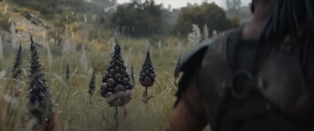 這顆被喚作「亡魂之地」的星球,簡直就是宇宙間最凶險的存在。導演丹卓登堡巧妙構築了一個危機四伏的生態系統,處處潛藏致命威脅。這裡不僅有能瞬間奪命的奇異巨鳥、令人措手不及的爬蟲巨獸,甚至連植物也演化出致命的防禦機制:會散發粉紅毒霧的詭異花草、發射毒針的危險植被,還有足以絞殺生命的纏繞樹藤。這一切精心設計的生物與環境陷阱,讓身處其中的每一步、每一次呼吸,都瀰漫著揮之不去的死亡氣息。