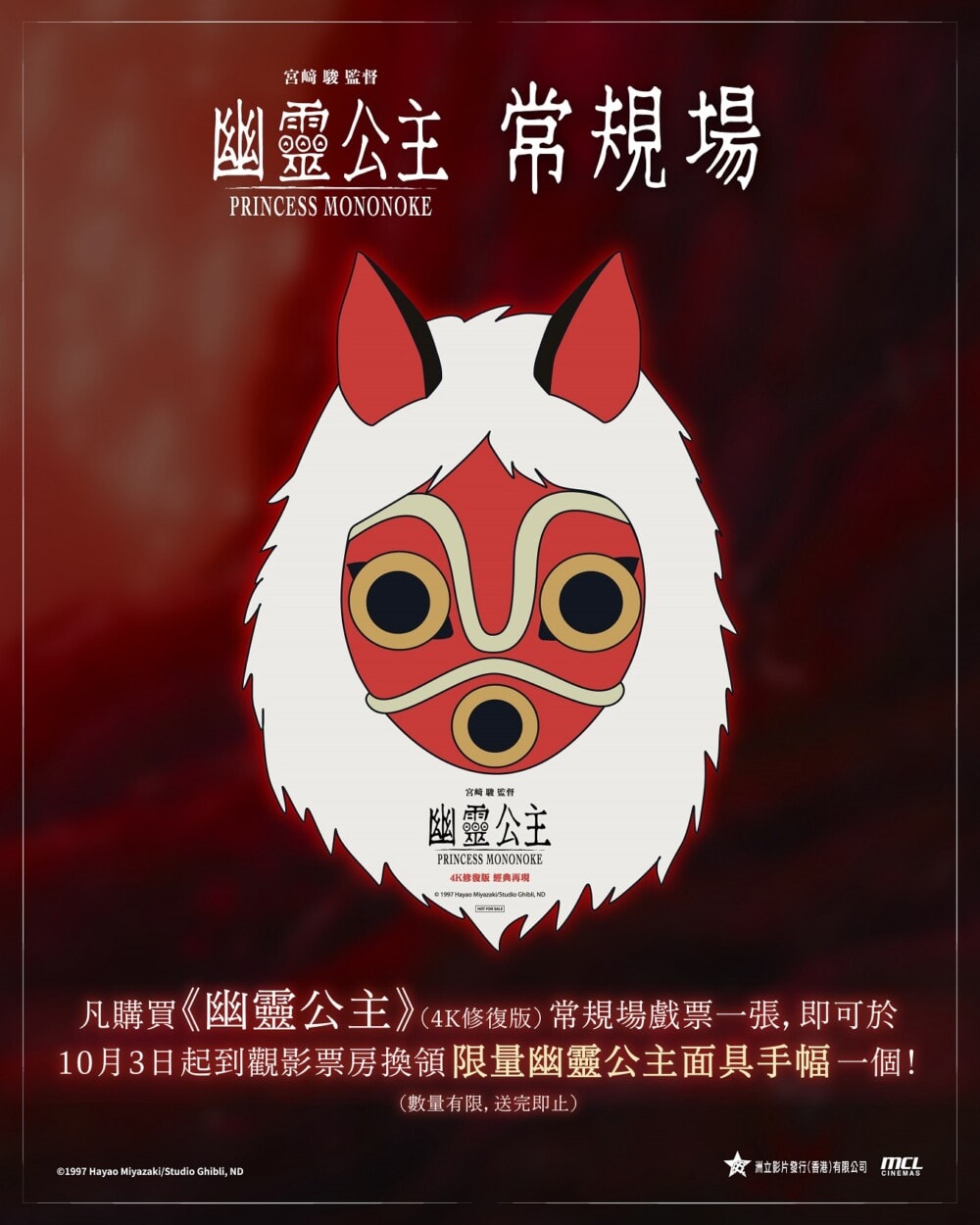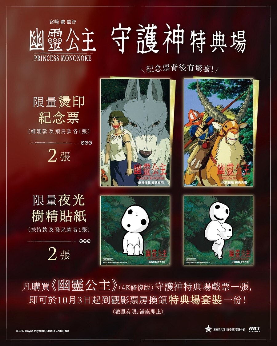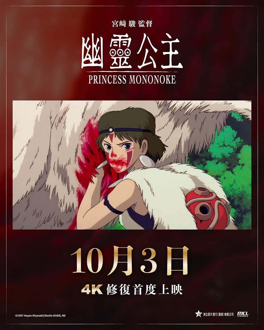 適逢吉卜力工作室成立四十週年,《幽靈公主》破天荒成為首部以IMAX格式呈現的吉卜力4K修復作品。4K修復版本不僅大幅提升了畫質清晰度,修復團隊成功重現了原作膠片特有的細膩質感與豐富色彩層次,讓觀眾得以用前所未有的視角,重新感受宮崎駿細膩的筆觸,並沉浸在久石讓震撼人心的配樂之中。MCL院線的特典場次大家也可以注意一下,有紀念票啊!